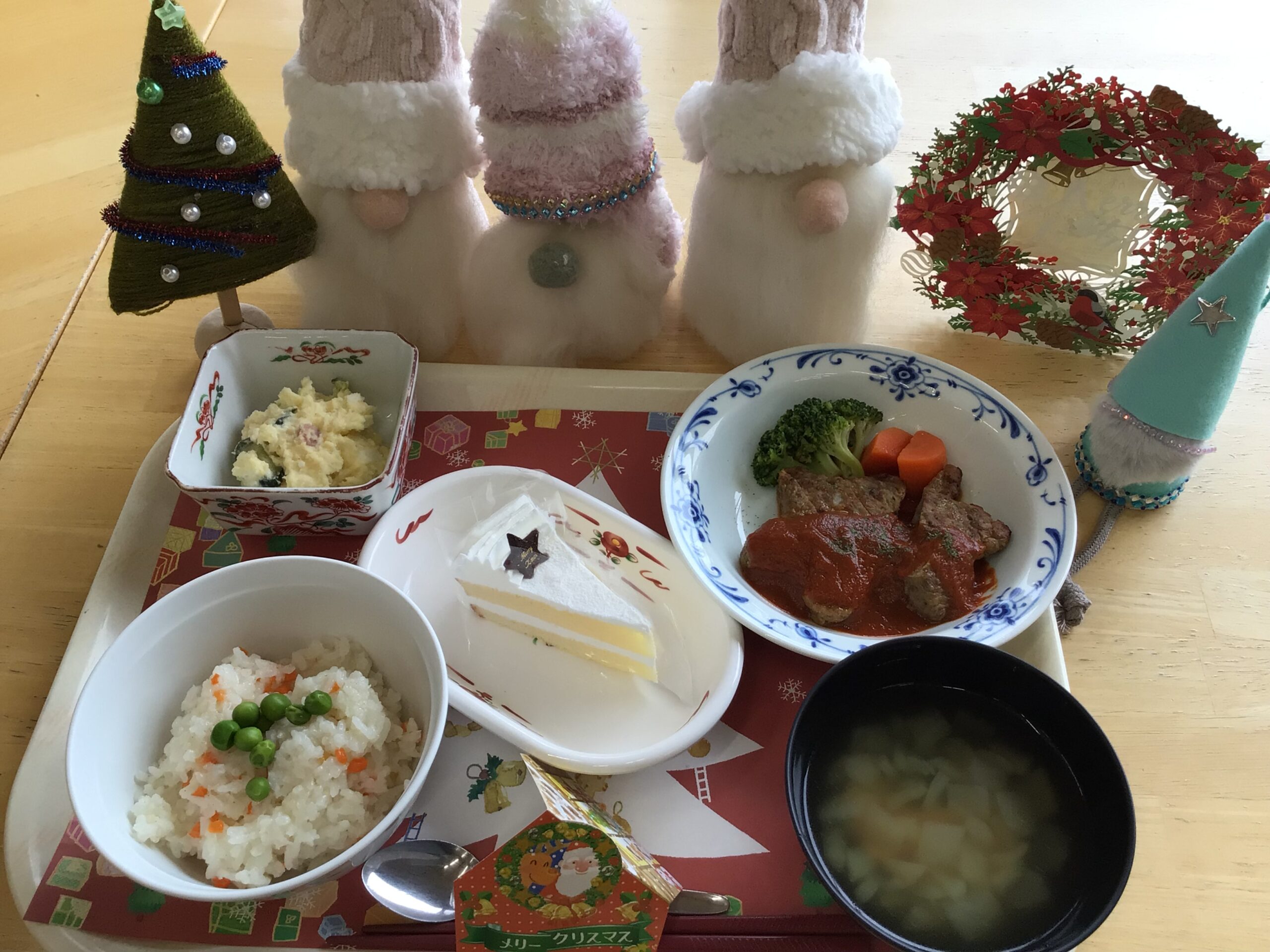 2025/12/25、恵の里ではクリスマス会と12月の誕生日会を行いました。3人の美人サンタさん達から プリンのプレゼントをもらった皆さんは、とても嬉しそうにありがとうと言われていました! お食事では、クリスマスケーキも楽しんでいただきました。