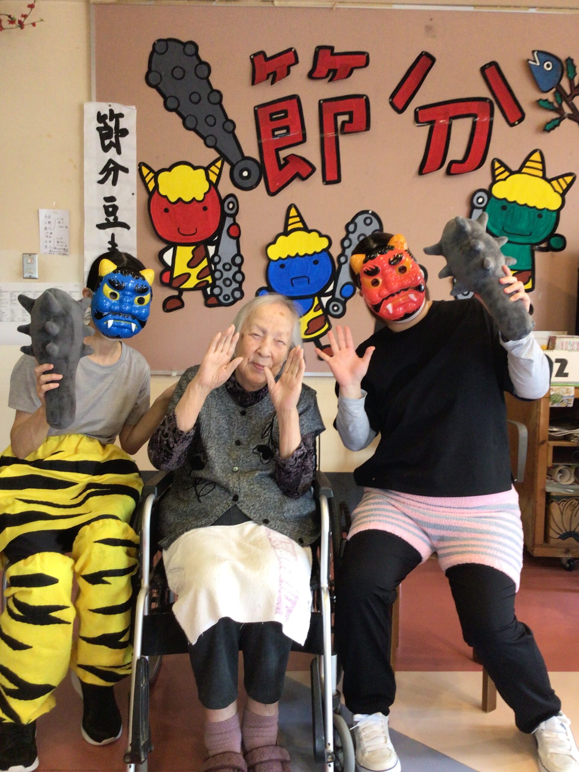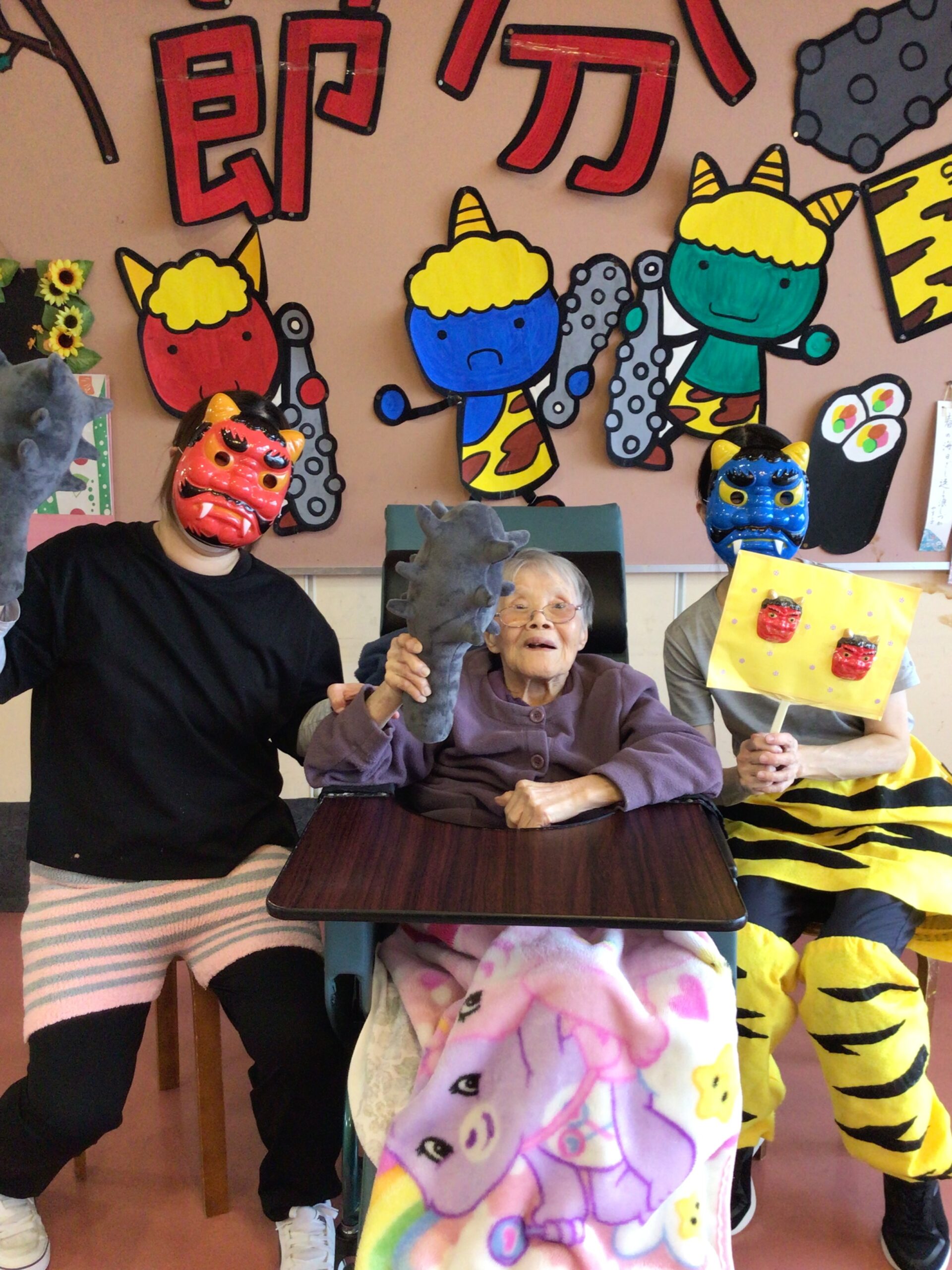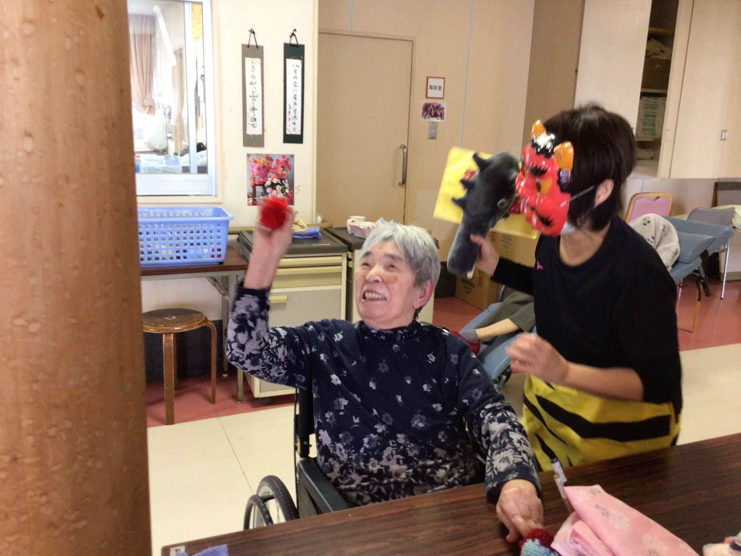 2026/2/3、恵の海では節分行事を行いました。毛糸で作った豆を、鬼が首からぶら下げた的に当ててもらい、大いに盛り上がりました!